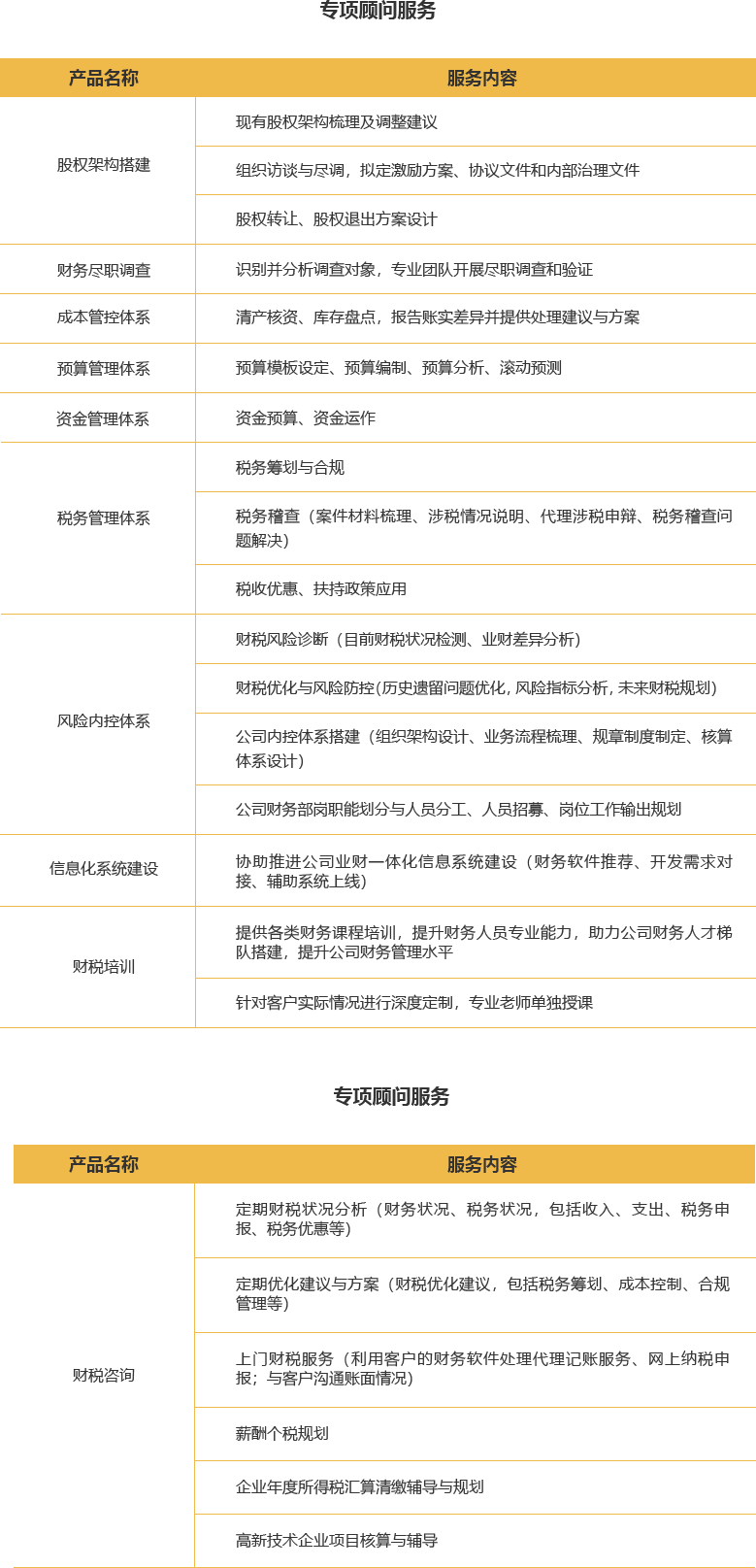 適用范圍:專(zhuān)項(xiàng)顧問(wèn)服務(wù),財(cái)稅咨詢(xún),業(yè)財(cái)融合
