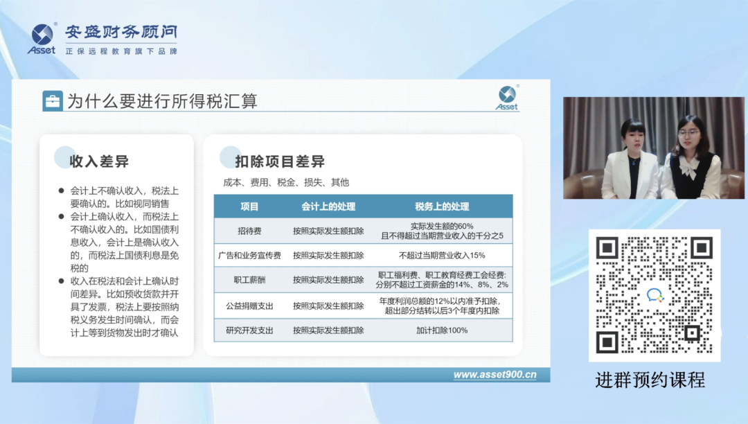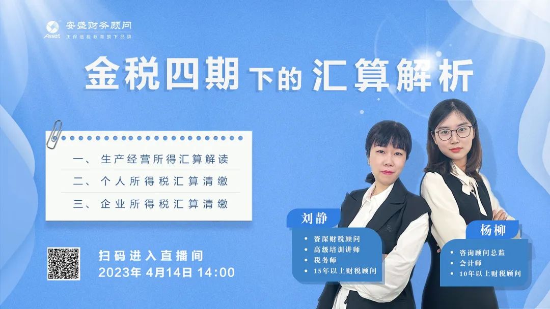 4月14日14時,安盛財務(wù)組織開展“安盛財稅云課堂”第七期——線上直播培訓(xùn)課《金稅四期下的匯算解析》,本次直播培訓(xùn)課邀請咨詢顧問中心劉靜老師和楊柳老師給大家進(jìn)行精彩的講解。